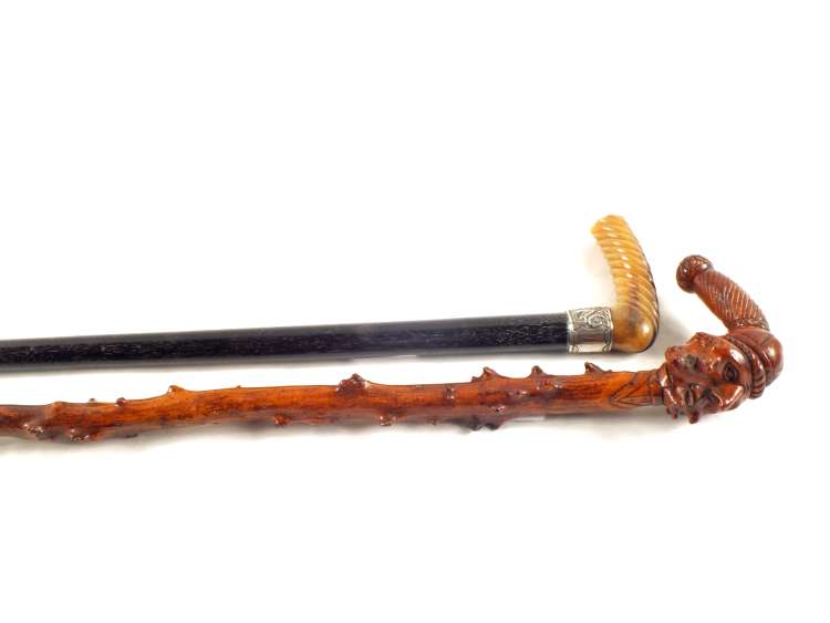 A gents walking cane with Silver band and horn grip plus a natural wooden stick with carved grotesque face grip