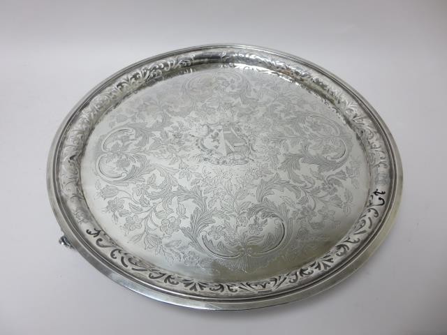 A George II silver circular Salver with floral scroll engraving, central coat of arms, initials and crest, pierced gallery on three scroll feet, London 1756, 14in diam, 35oz, slight damage