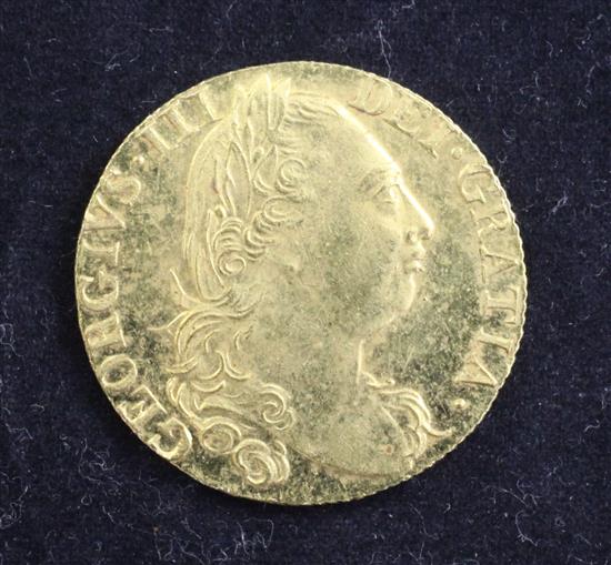 A George III gold guinea, 1777, Fourth head, good VF