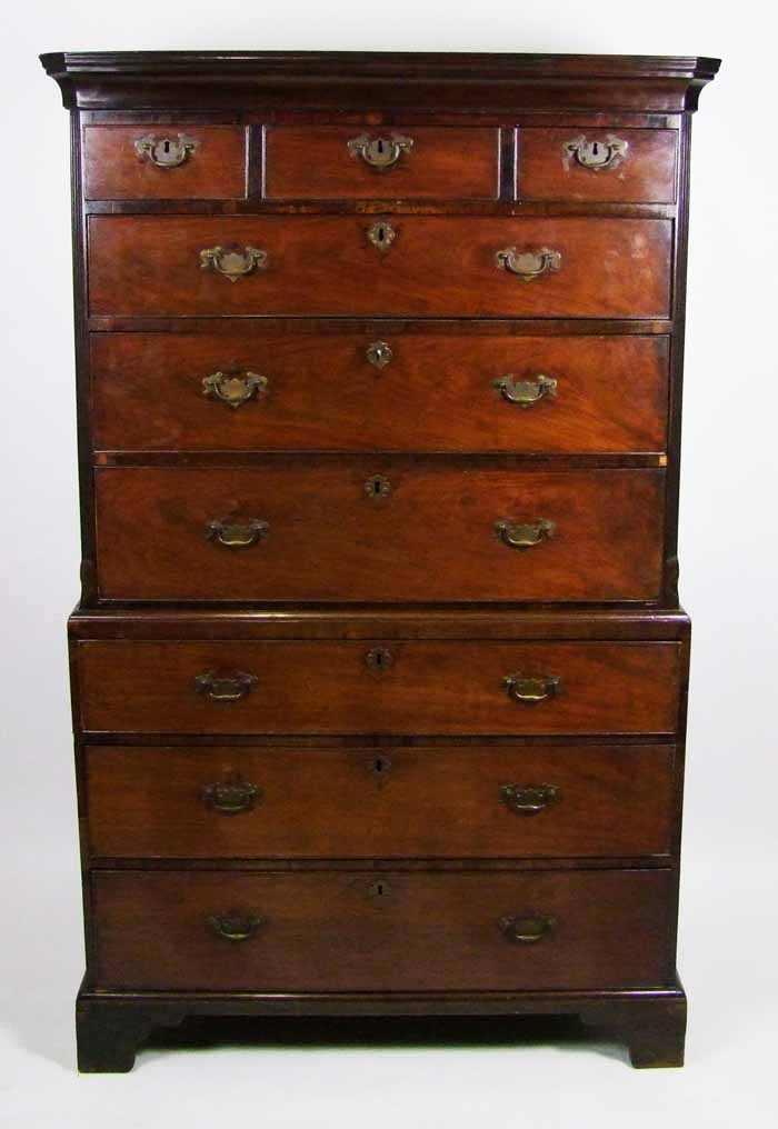 the upper section fitted with three short and three long graduated drawers, the base with three long drawers, on shaped bracket feet