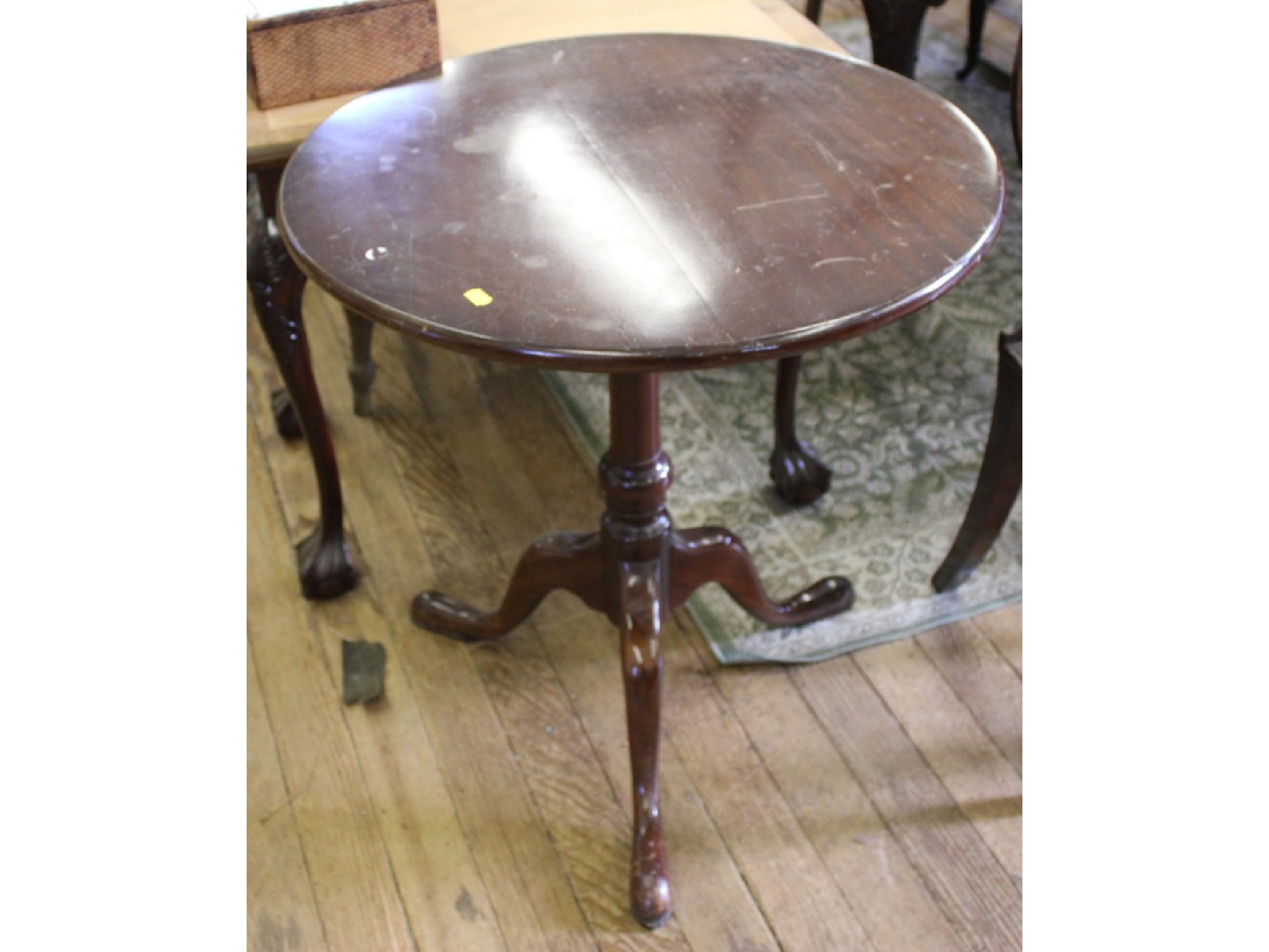 A George III style mahogany tilt top tripod table, the circular top on a birdcage hinge and cabriole legs