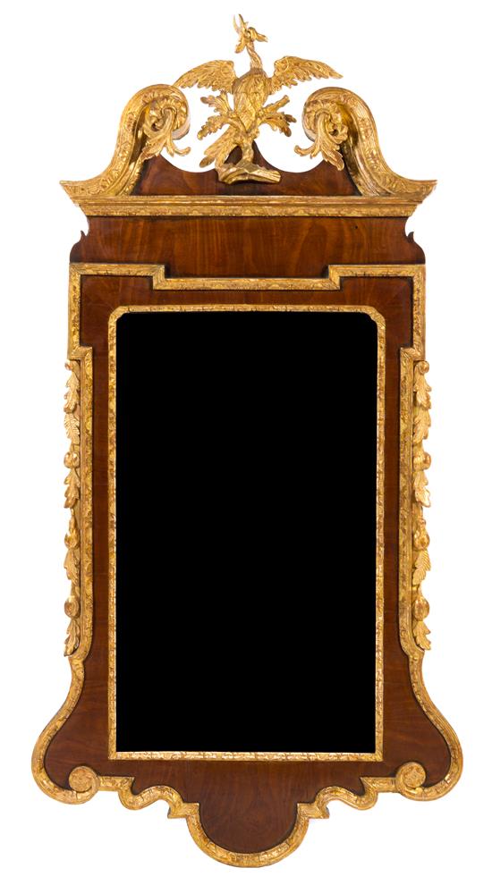the beveled mirror plate within a shaped frame surmounted by a swan's neck pediment centered by a bird-of-paradise.