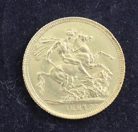 A George IV gold sovereign, 1821, occasional nicks, edge dents otherwise EF