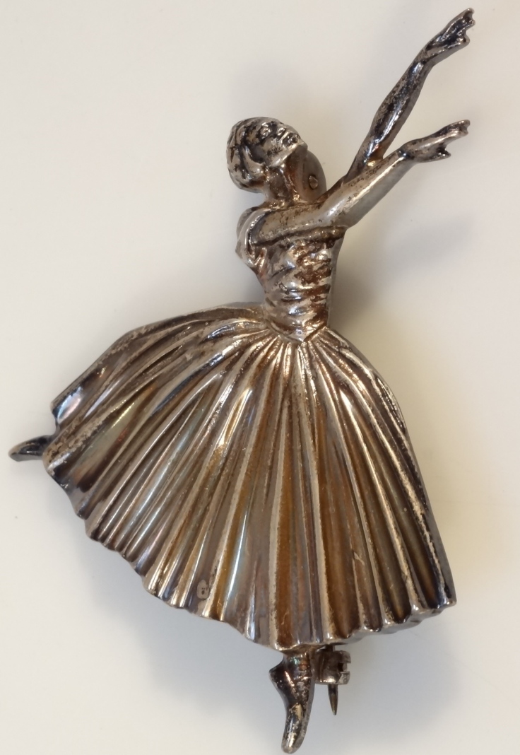 formed as a lady dancing with arms out stretched with plain pin back, Birmingham 1925, 8cm high, ½oz.