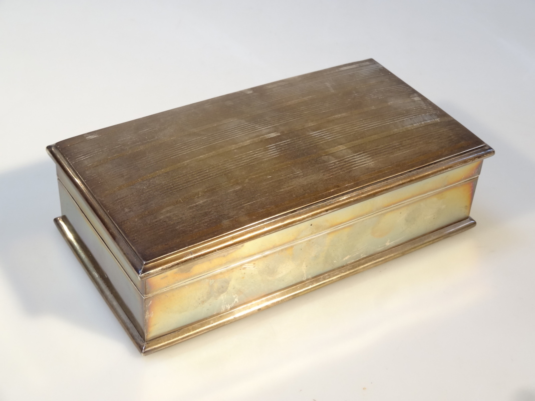 by F W R with engine turned lid revealing a cedar lined sectional interior, Birmingham 1927, 5cm high, 18cm wide, 9.5cm deep.