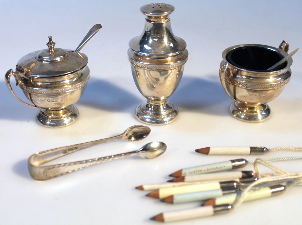 comprising pepper pot, 9.5cm high, mustard pot and open salt, with two associated spoons and a similar pair of sugar bows and a small quantity of miniature pencils attached to a string with white metal mounts, Sheffield 1920, etc, 5½oz of silver. (a