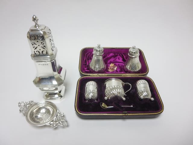 A George VI silver square section Sugar Caster, Birmingham 1937, three piece Condiment Set, Birmingham 1882, in case, pair of Pepperettes, London 1850 and a Tea Strainer, Chester 1912