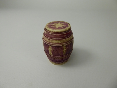 A Georgian Barrel-Shaped Carved Bone Nutmeg Grater, dyed red with etched design