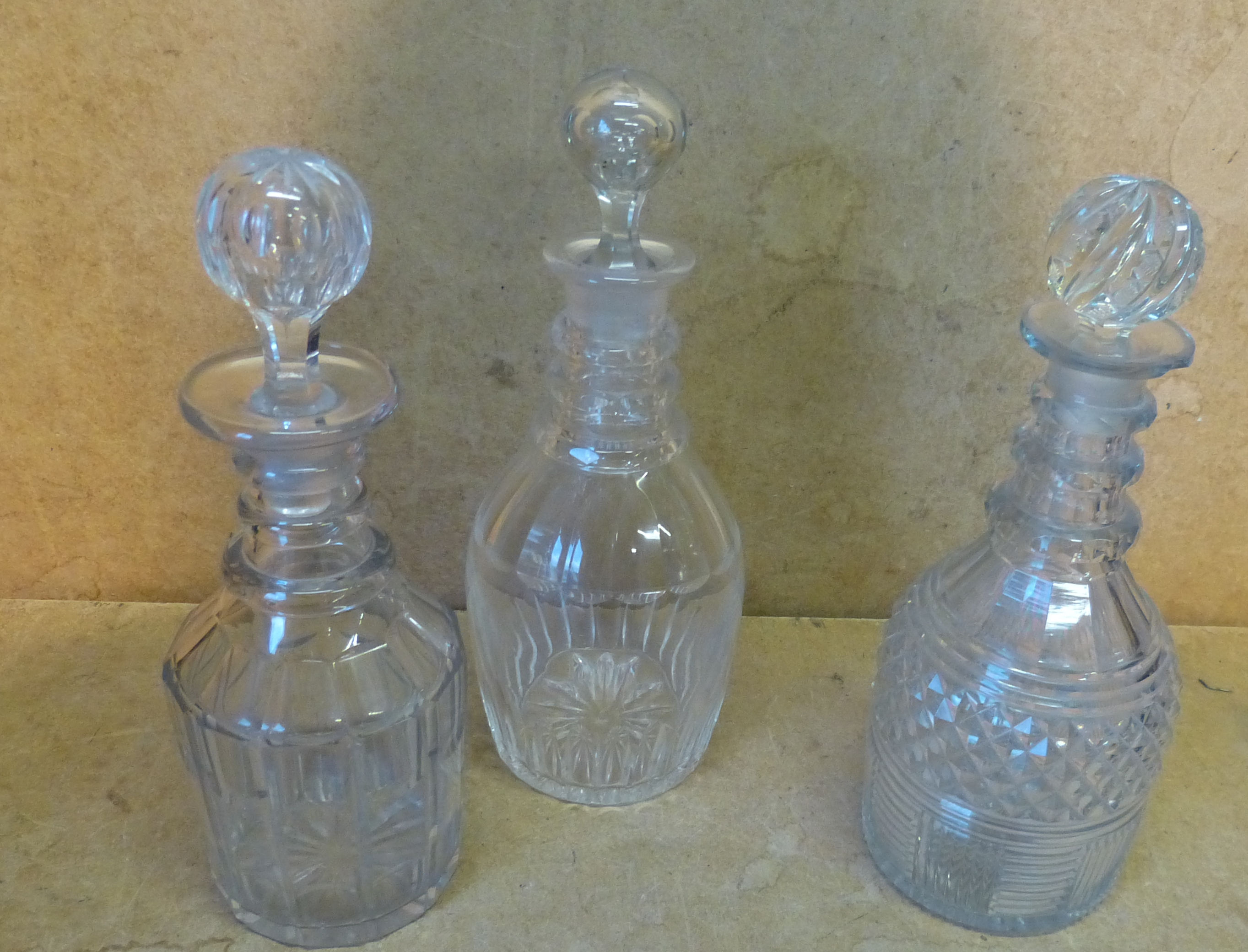 another Georgian cut glass ring neck decanter with tooth cut decoration (slight chip to rim) also another smaller decanter (3)