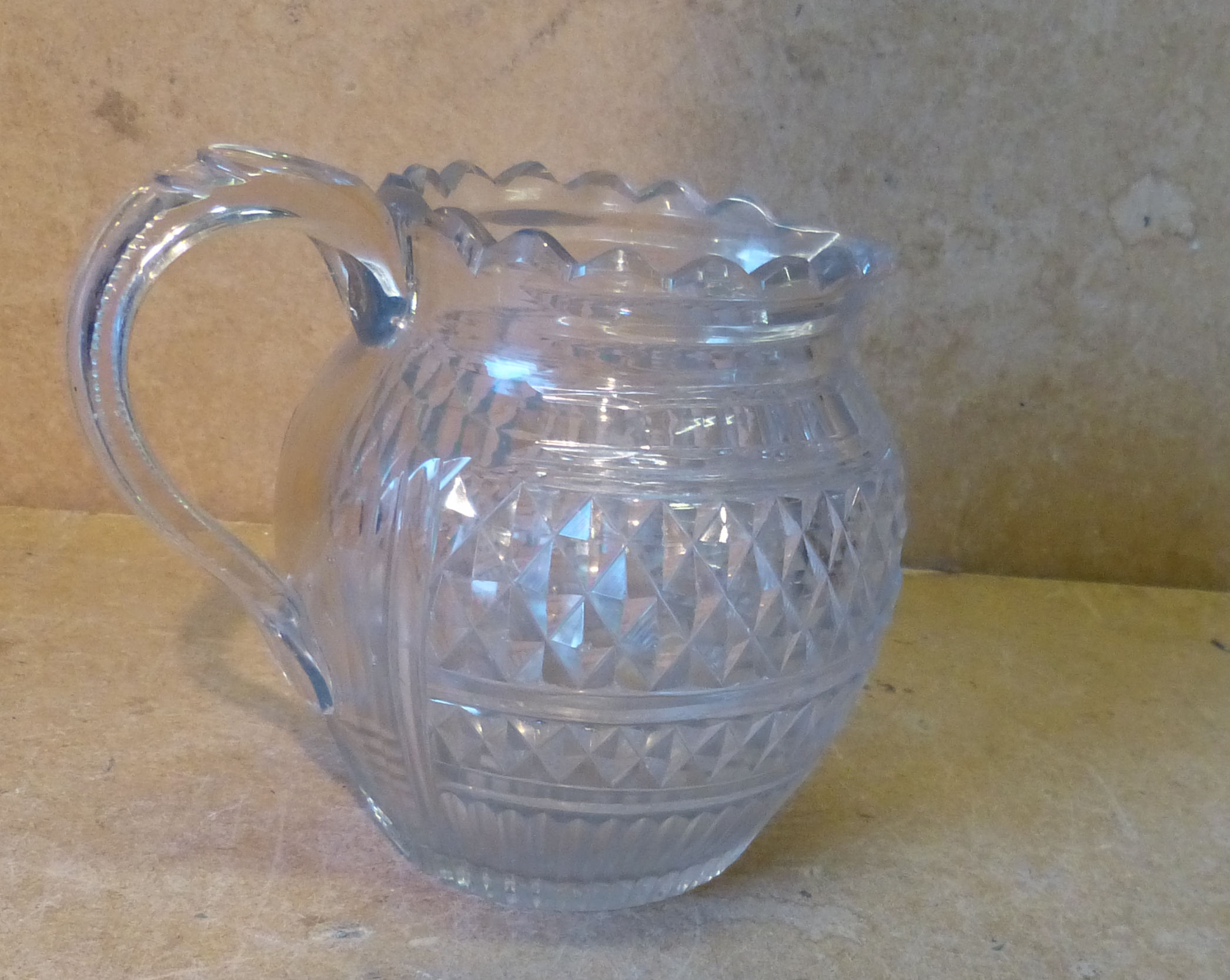 A Georgian Cut Glass Bulbous Milk Jug having scalloped shape rim with tooth cut decoration