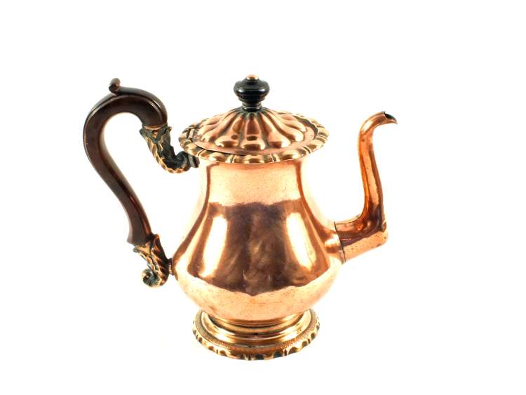 A Georgian seamed Copper coffee pot with gadrooned lid and treen swan neck handle