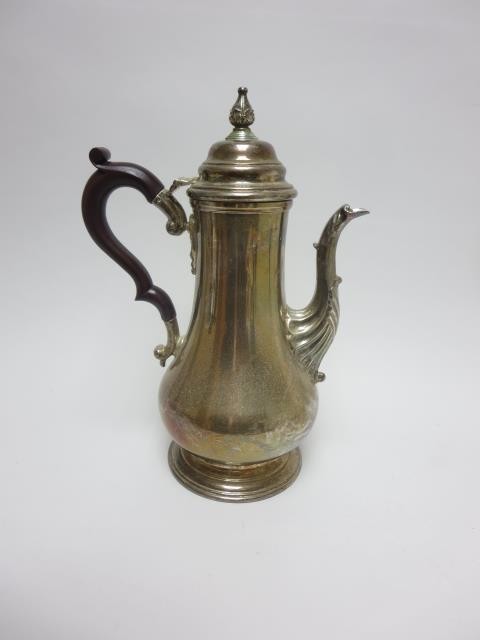 A Georgian style silver baluster Coffee Pot with wooden scroll handle, Birmingham 1968