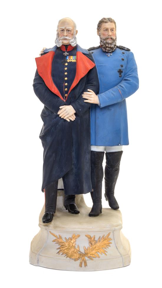 depicting German Emperor Frederick III with his father William I, raised on a shaped base, bearing a blue anchor mark to the underside.