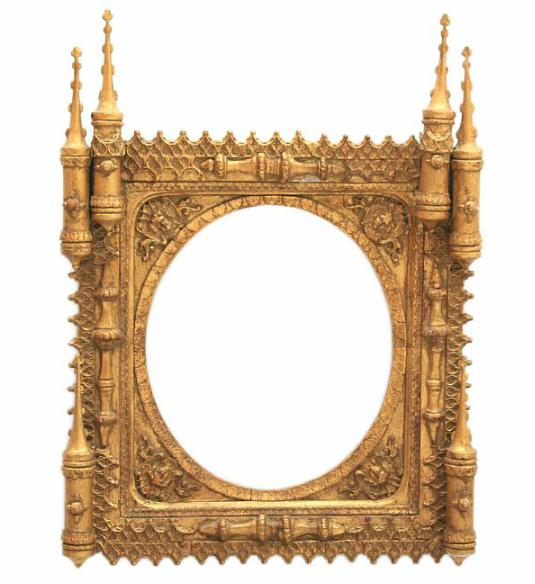A gilded wooden and gypsum frame, richly carved with spires, architecture, and faces