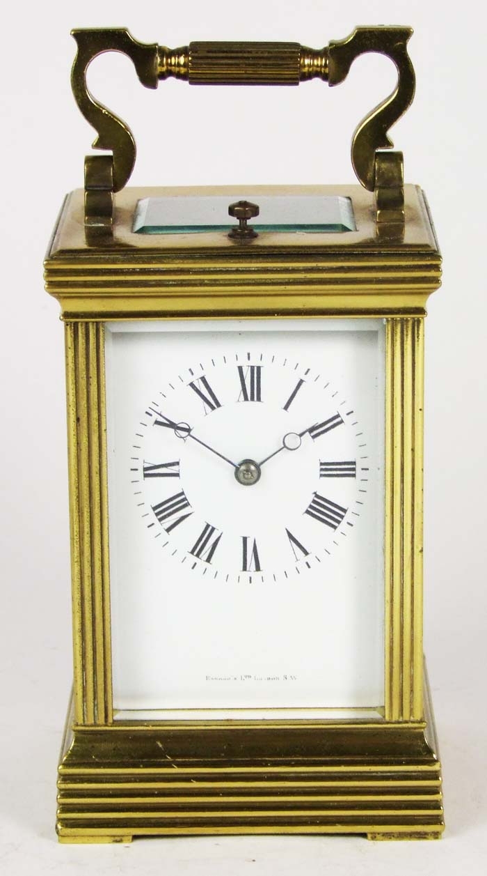 A gilt brass carriage clock, the white enamel dial signed Harrods, with repeat movement striking on a gong