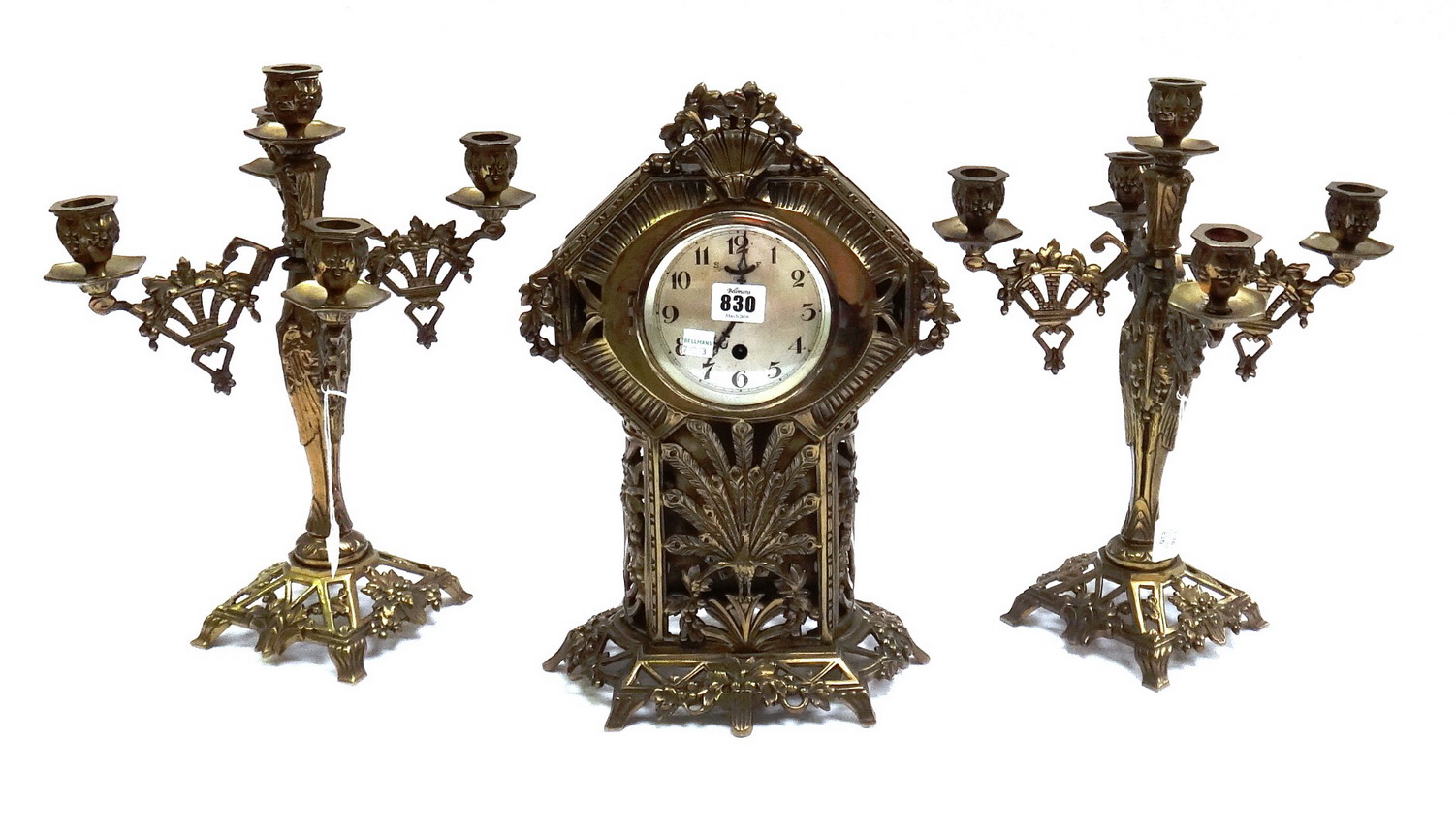 the angular case cast with peacock and foliate masks with matching five branch candelabra garnitures