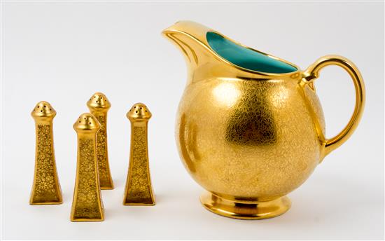 together with two pairs of salt and pepper shakers, the pitcher marked Wheeling Decorating Glass China to the underside.