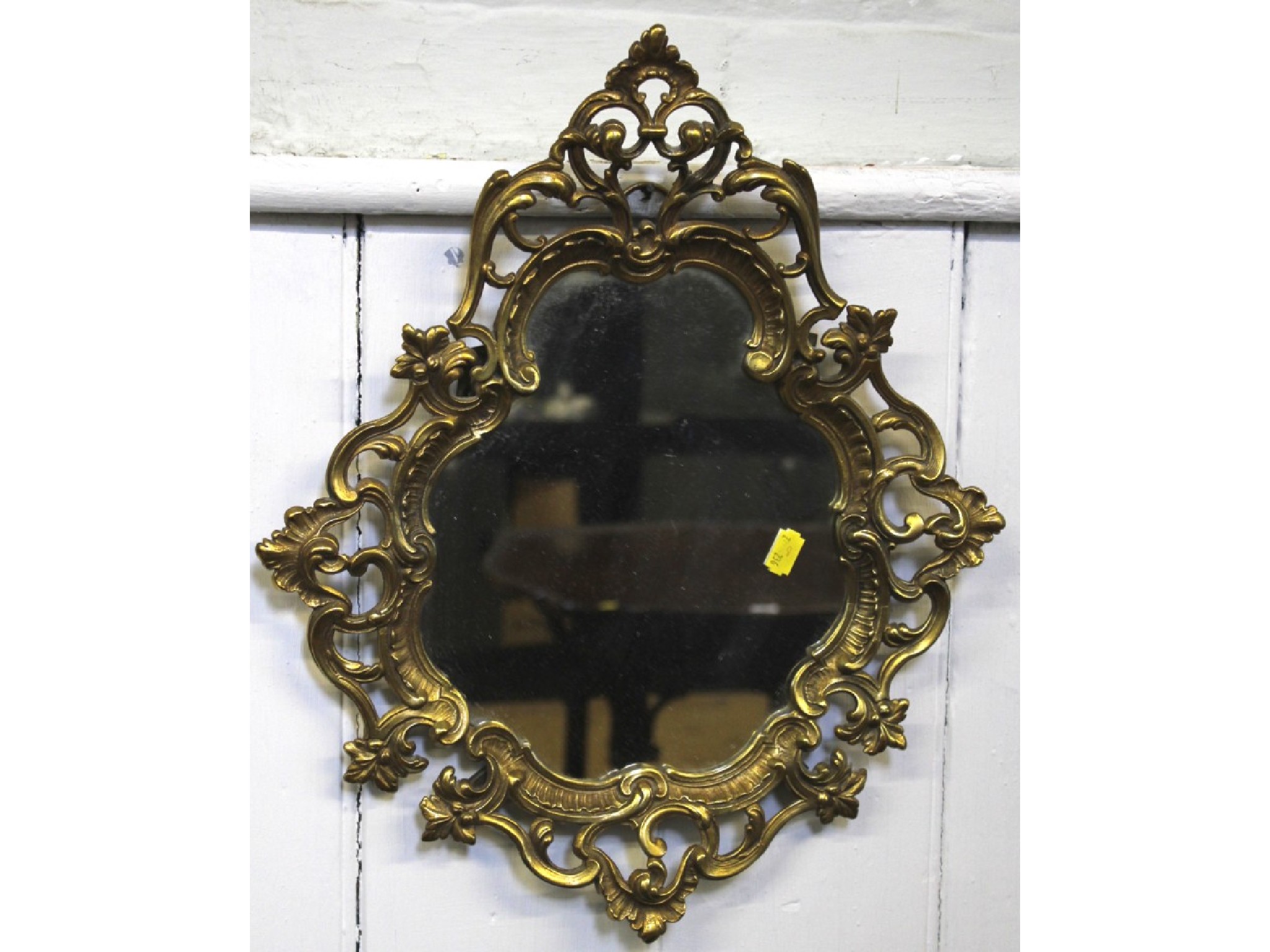 A gilt metal wall mirror, of Rococo design with open scrolls, shaped mirror plate