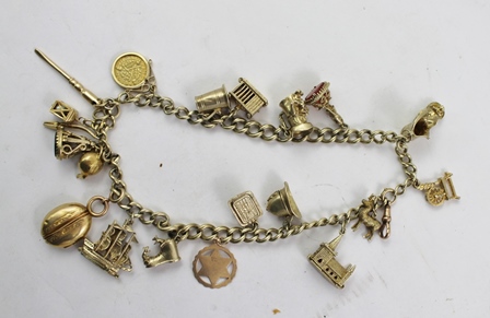 A GOLD COLOURED METAL AND 9CT GOLD COMBINED CHARM BRACELET
