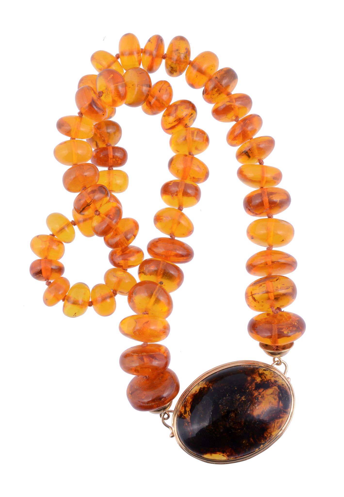 composed of disc shaped amber beads, on a knotted string, to the clasp set with an oval shaped amber cabochon, 62cm long