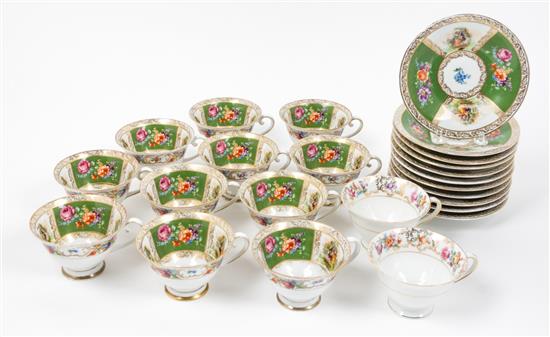 comprising 11 cups and 11 saucers, each with alternating floral panels, together with two associated tea cups (twenty-four pieces total).