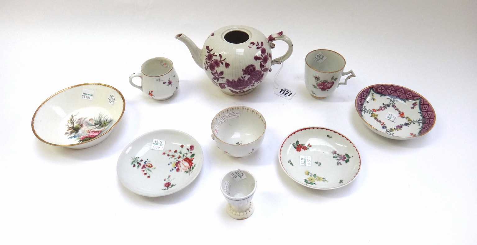 each piece painted in polychrome with flowers, comprising; a Frankenthal custard cup, with blue painted mark, a Doccia coffee cup and a Doccia saucer, a Zurich teapot, a Hague decorated cup, with blue painted mark, a Cozzi saucer, and a Furstenburg s