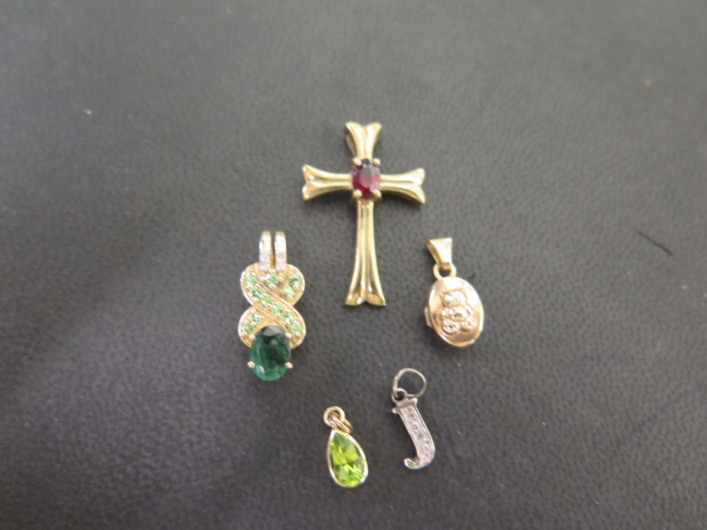 A group of five pendants - Some gem-set - Three with marks indicating 9ct gold