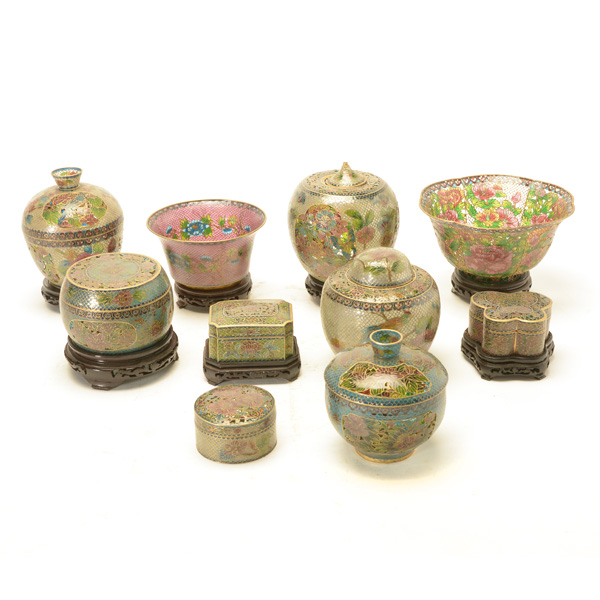 Comprising two bowls, four covered boxes, and four lidded jars, each heavily decorated with various flowers, birds and butterflies, seven accompanied by wood stands. {Tallest: 7 1/2 inches (19 cm)} [Small cracks]