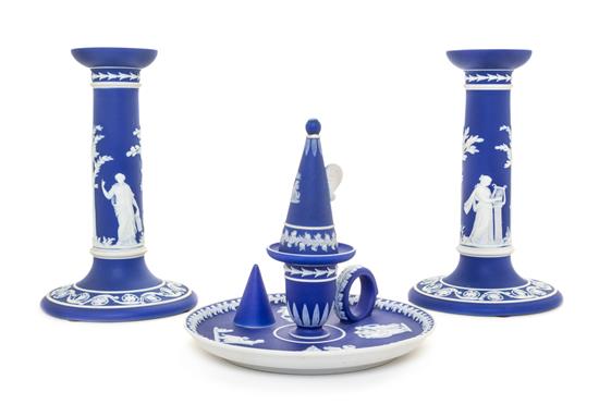 comprising a pair of candlesticks and a chamber candle holder with a snuffer, each with an impressed Wedgwood mark to the underside.