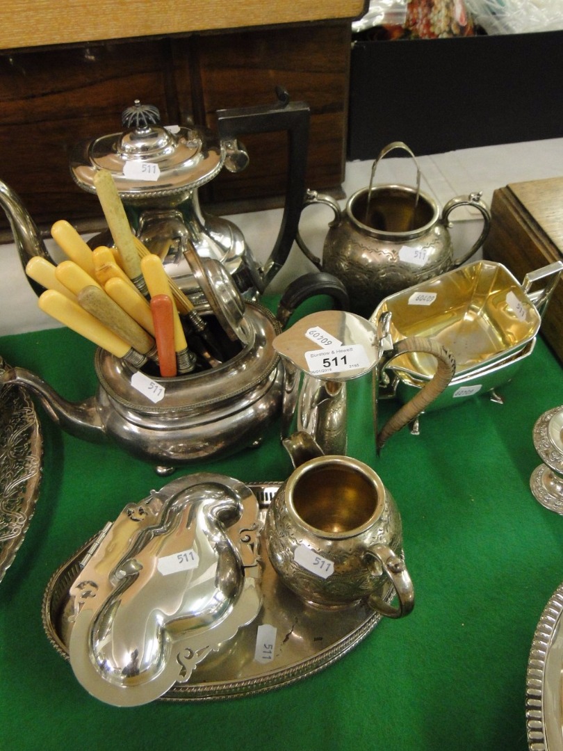 A half fluted plated coffee pot, teaware, sauceboats, cutlery, candelabra, etc.