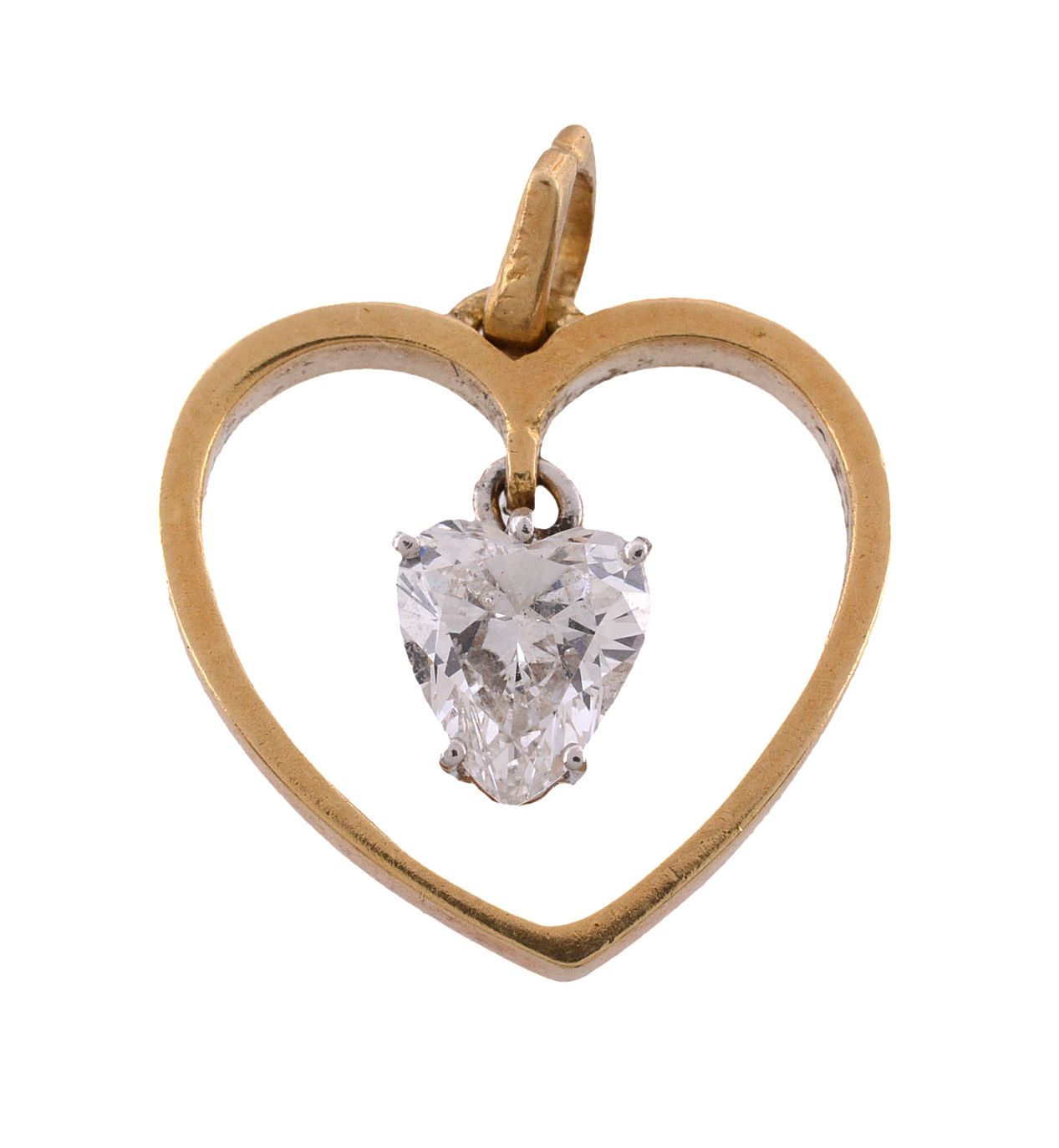 the central heart shaped diamond within an openwork heart shaped surround, stamped 750, 2.2cm long including bale