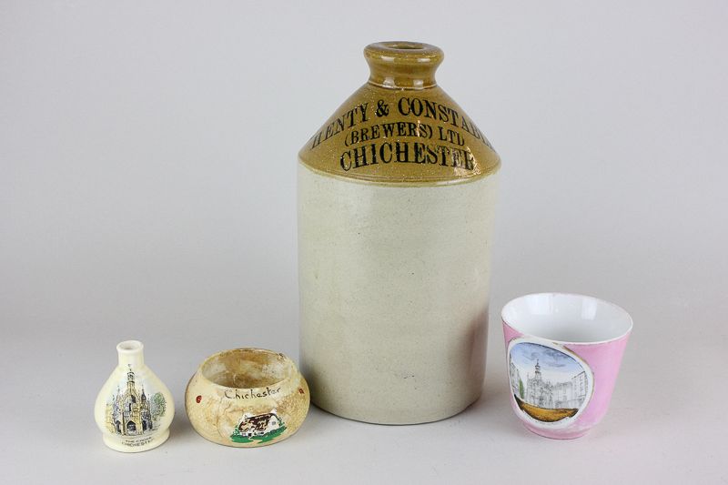 A Henty & Constable Brewers Ltd Chichester stoneware flask, a teacup depicting the Market Cross Chichester with pink and gilt surround, a small souvenir vase also depicting the Cross and a small pot marked Chichester