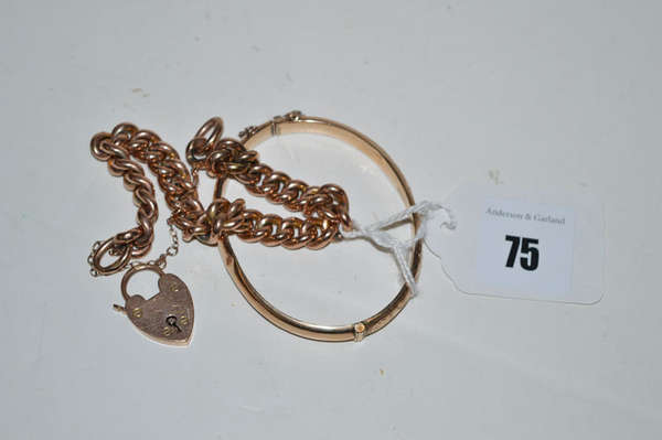 A hollow cast 9ct. yellow gold bangle, half engraved with feathered scrolls; together with a hollow cast curb link bracelet, 9ct. yellow gold heart-shaped locket clasp.