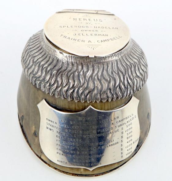 A trophy of horse races in the form of a horseshoe. With silver frame that mimics horsehair with a lid and a shield inscribed on the front. Foreign. Hover to zoom