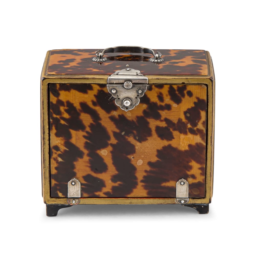 the rectangular top applied with hinged handle, the hinged fall-front enclosing five drawers, in sizes, a covered incense container and a rectangular tray, raised on bracket feet, minor loss to the tortoiseshell, 8cm high, 9,2cm wide, 5,5cm deep