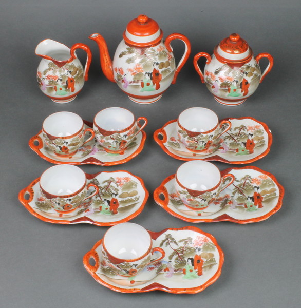 A Japanese egg shell porcelain part tea set comprising teapot, lidded sugar bowl, milk jug, 6 cups and 5 double saucers