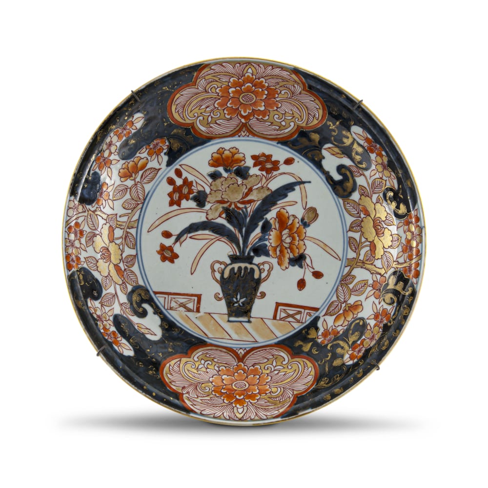 circular, the centre painted with a flower-filled jardinière enclosed by a double blue-line, the border painted with various flowerheads and scrolling foliage, gilt rim, the reverse with three sprays of flowerheads above a double blue-line, raised on