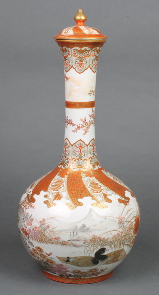 A Japanese Kutani baluster vase with elongated neck and lid decorated with exotic birds amongst flowers