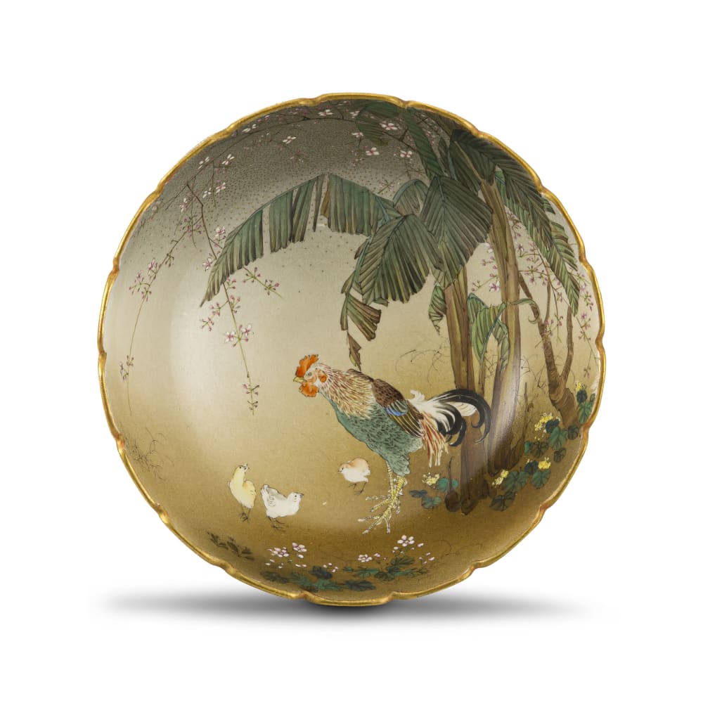 the centre decorated with a cockerel and three chicks before palm trees and cherry blossoms, petal-shaped gilt rim, the lobed exterior decorated with two small birds amongst wisteria, raised on a low foot with gilt line border, iron-red and gilt Kink