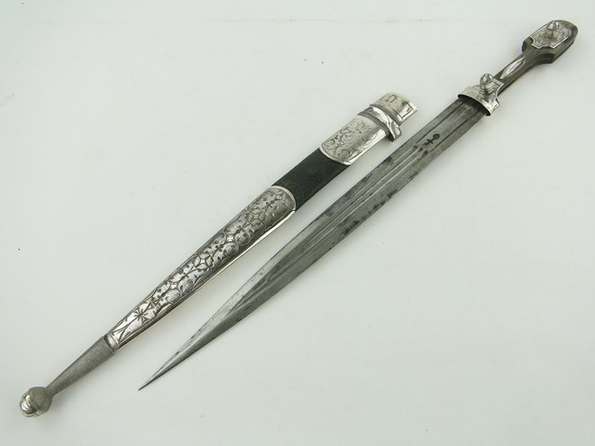 A Kindjal dagger with engraved white metal mounts and horn hilt