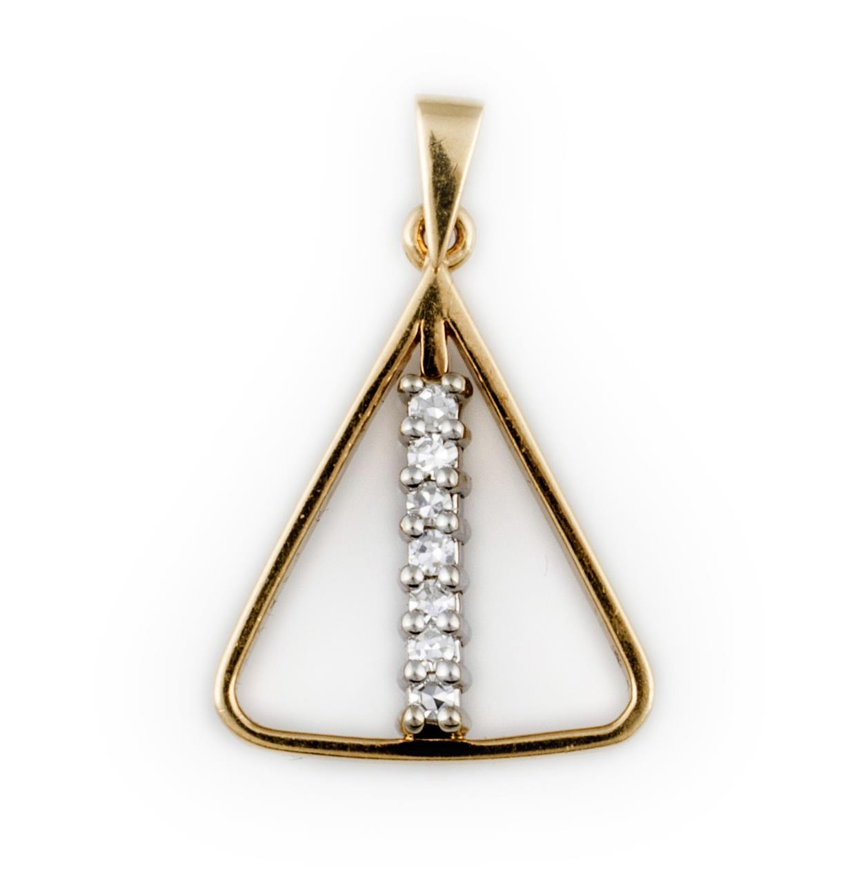 A lady's 14kt yellow gold triangular shaped pendant, set with seven single cut diamonds having a tw of 0.21 cts