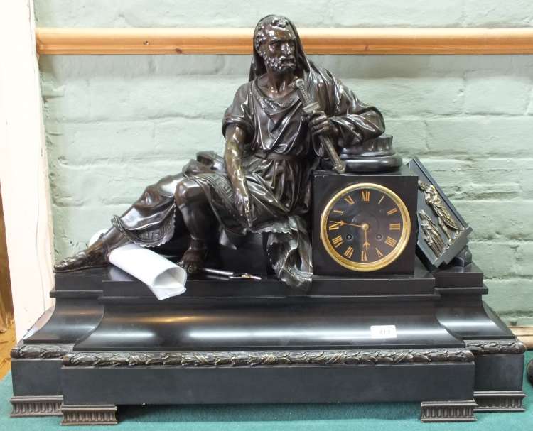 A large and heavy black slate clock with bronzed mount of a seated Greek figure
