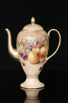 A large coffee pot painted in the round by former Royal Worcester artist Paul English with hand painted apples, peaches and black cherries, the reverse with peaches and grapes, printed mark, signed, height 27cm