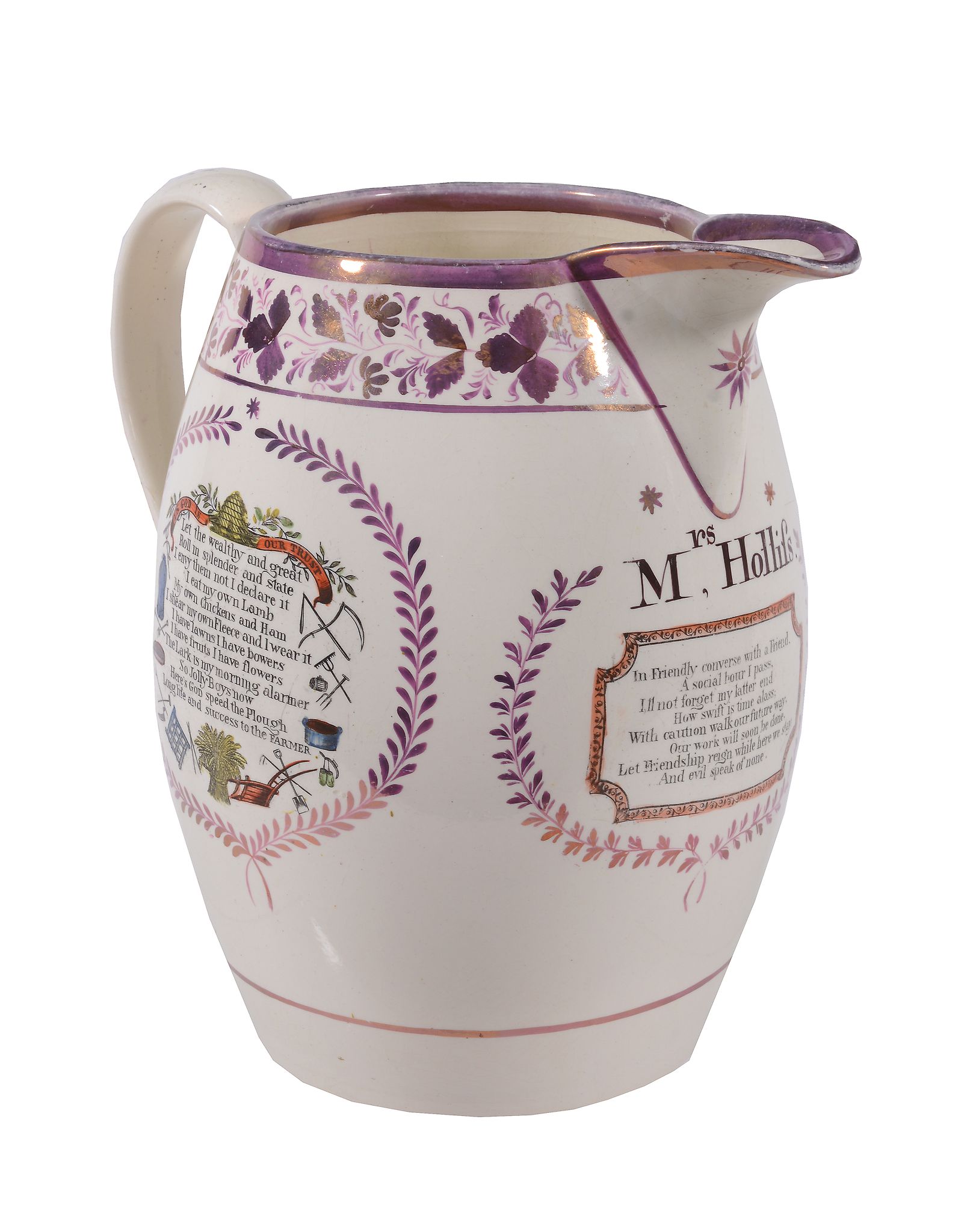 A large English creamware pink-lustre barrel-shaped commemorative jug