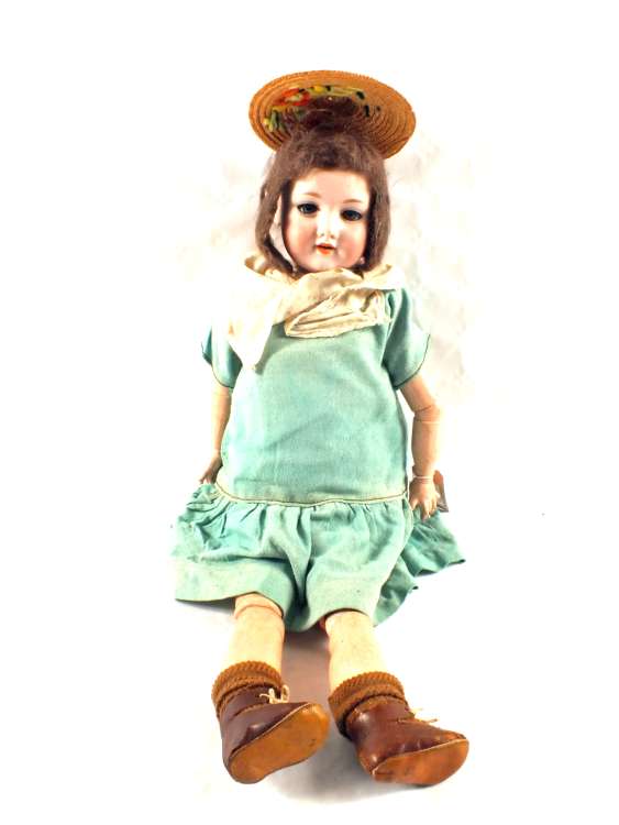 A large German doll with porcelain head, Armand Marseille with original sock and leather booties