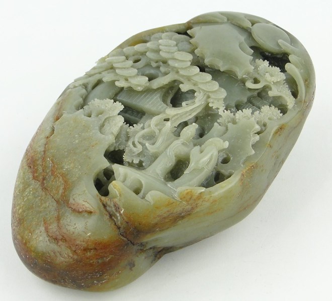A large jade boulder carving with relief carved figures, pine tree and buildings, 8.5''.