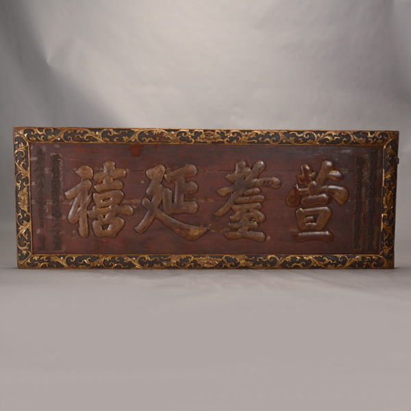 Carved in relief with a four-character title to the center, dated, framed by a scrolling leafy border and highlighted by gilt paint. Seventh Year of the Guangxu Period (1877) {34 1/4 x 92 x 2 inches (87 x 234 x 5 cm)} [Cracks, losses, discoloration,