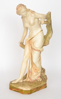 A large Royal Worcester figure of the Bather Surprised, after the original by Sir Thomas Brock, modelled as a scantly clad maiden stooping before a stump under ivory and shot enamel colours on a canted rectangular base, height 66cm, restored