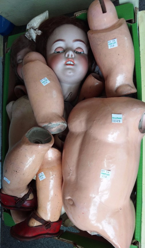 approximately 100cm (currently in pieces), together with an Armand Marseille bisque head doll, mould no.390, a small Kramer & Reinhart bisque head doll, and various doll parts (a.f). (qty)