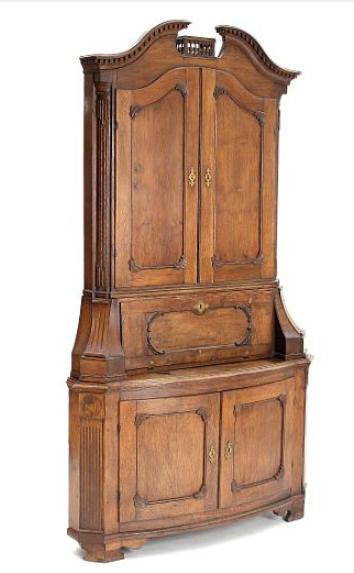 A late 18th century Danish Transistion oak corner cabinet, front with writing leaf and four doors